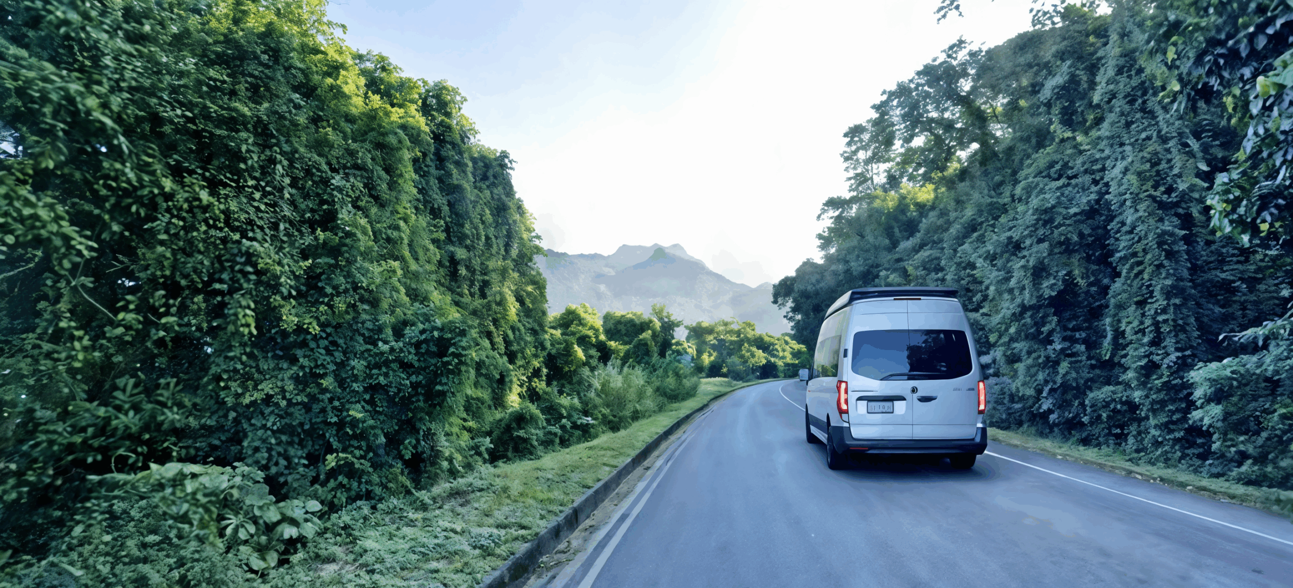 A van travels along the road between Ilha Grande and Rio de Janeiro, surrounded by lush green landscapes, winding paths, and breathtaking views of Brazil's natural beauty.